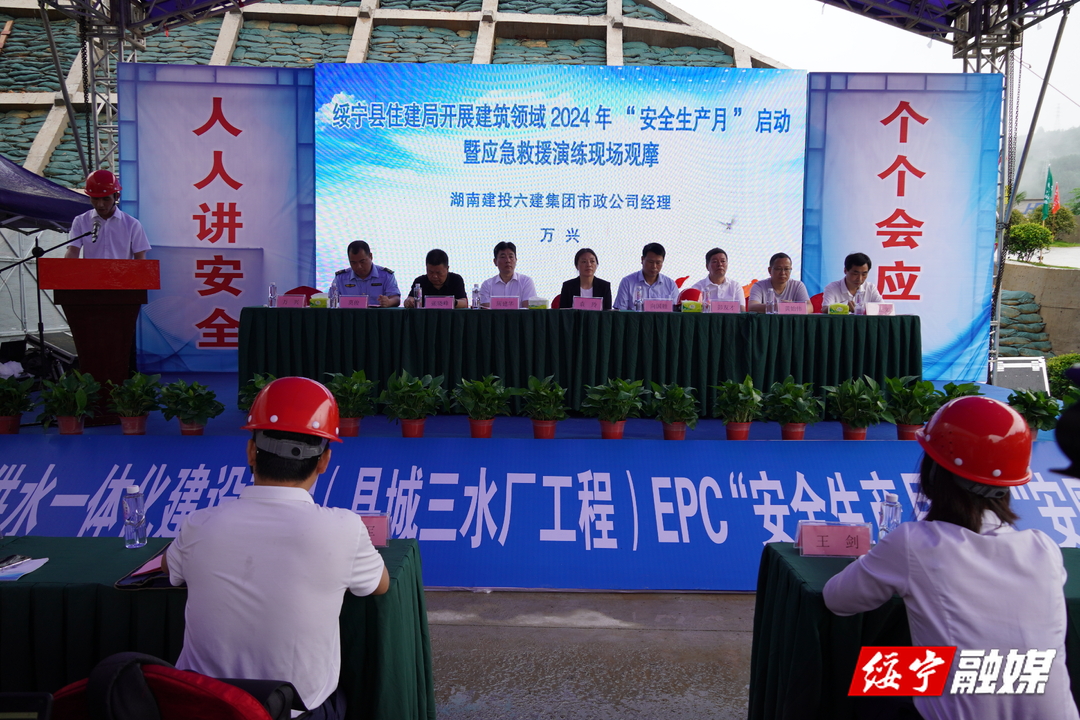 绥宁新闻网讯(记者 邓钊)6月17日,2024年邵阳市施工质量安全标准化工地观摩暨绥宁县建筑领域“安全生产月”启动仪式在绥宁县三水厂项目厂区举行。邵阳市建设工程质量安全监督和造价站站长周建华,县委常委、县委办主任袁玲,县委常委、政法委书记向国胜参加。