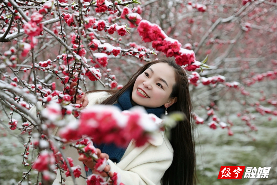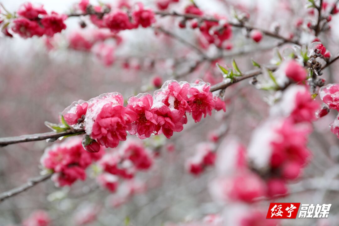 雪映桃花,三分骨相美,七分氛围感。真可谓是“春暖乍寒二月来,雪落桃花满园春”。初开的桃花吸引不少游客前来赏花踏青,感受春天的气息,沾沾桃花的运气。