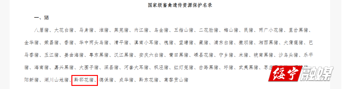绥宁新闻网讯(记者 陶雯)近日,农业农村部第940号公告公布《国家级畜禽遗传资源品种名录》,绥宁县地方优良猪种“黔邵花猪”成功入选。这一成果标志着该地方特色猪种获得国家层面权威认可,为当地畜禽种业振兴与乡村振兴注入强劲新动能。