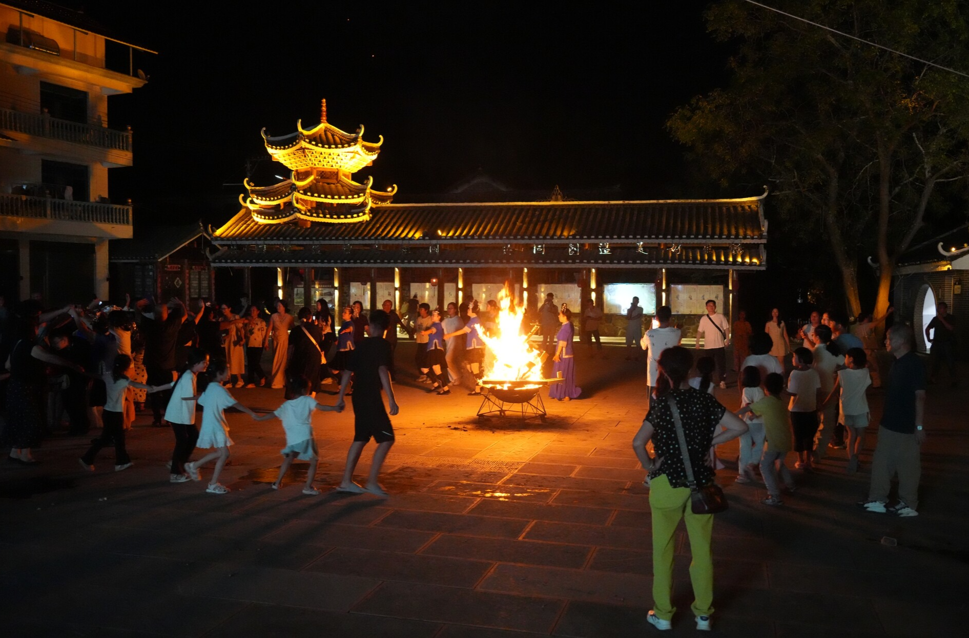 “来!手拉手,跟着节奏跳!”当节目表演接近尾声,广场中央燃起篝火,身着民族服饰的演员向游客抛出邀约。跳花跳月——这个苗族青年男女以舞传情的传统仪式,此刻成了全民参与的欢乐派对。无论是白发老人还是孩童,都加入了转圈、踢腿、扬手的行列,笑声与芦笙曲交织,火光映红了每一张笑脸。